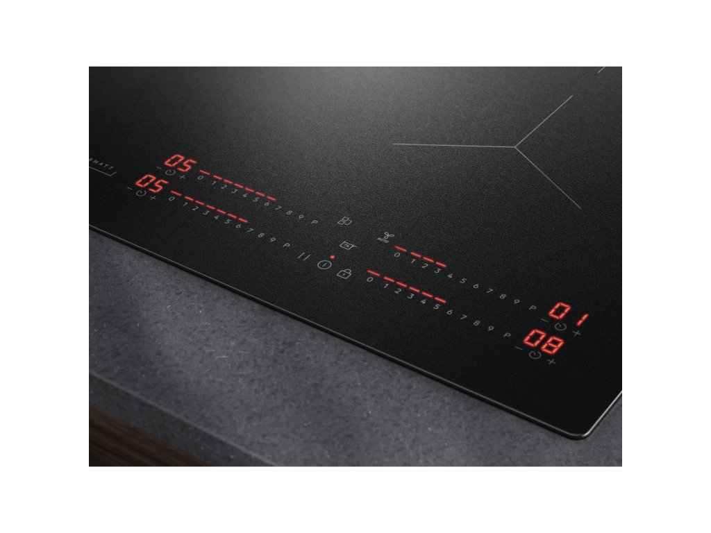 | Kontrolní funkce: | 3 krokové využití zbytkového tepla, akustický signál, dětský zámek, Eco časovač (využití zbytkového tepla), zajištění/odjištění ovládacího panelu, minutka, pauza, vypnutí zvuku, funkce POWER (Booster) = rychlé ohřátí, flexibilní Power Management, propojen s odsavačem Hob2Hood, Heat memory, Samostatné ovládací zóny, Levý Bridge, SenseCook Boil |