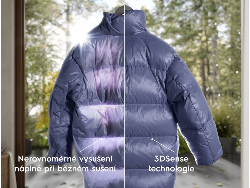 Naše jedinečná technologie 3DSense zjišťuje vlhkost v oblečení pro jeho přesné a úplné vysušení. Tím zajistí dokonalý výsledek i u peřin, polštářů nebo oděvů ze silné vícevrstvé látky. Péřové bundy si uchovají svůj vzhled a zůstanou nadýchané s dokonalou tepelnou izolací. *Testováno na základě normy ISO 11092 pro udržení tepelné izolace přikrývek/prádla usušených technologií 3DSense.